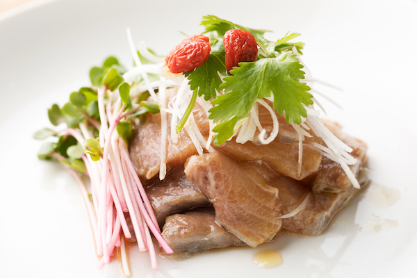 3品目:黒毛和牛の湯引き 怪味ソース(花山椒と練りゴマを使用したピリ辛ソース)