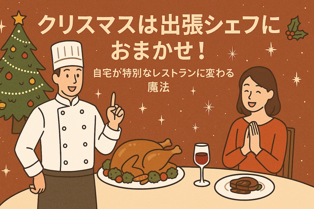 今年も、もうすぐクリスマス。 家族や大切な人と、素敵な時間を過ごしたいけれど、クリスマスの準備は何かと忙しいですよね。 料理の準備や後片付けを考えると、少し気が重くなる人もいるかもしれません。 そんなあなたに、おすすめなのが「出張シェフ」サービス。 自宅が、まるで特別なレストランに変わる魔法のような体験ができます。 この記事では、出張シェフの魅力から、料金、予約方法、そして最高のクリスマスを叶えるための情報まで、詳しくご紹介します。 今年は、出張シェフと一緒に、最高のクリスマスを迎えませんか?